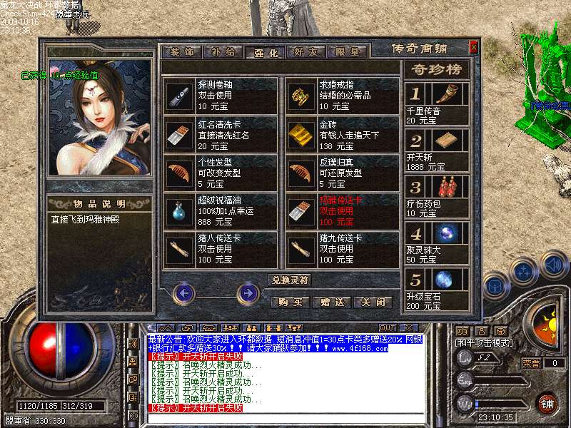 6:新增元宝地图:传送员-终极区域-30元宝地图:恶魔世界,BOSS之家,古墓三层.商铺:玛雅神殿,猪洞8,9层,九连珠-烟花之地.(又捞一笔)