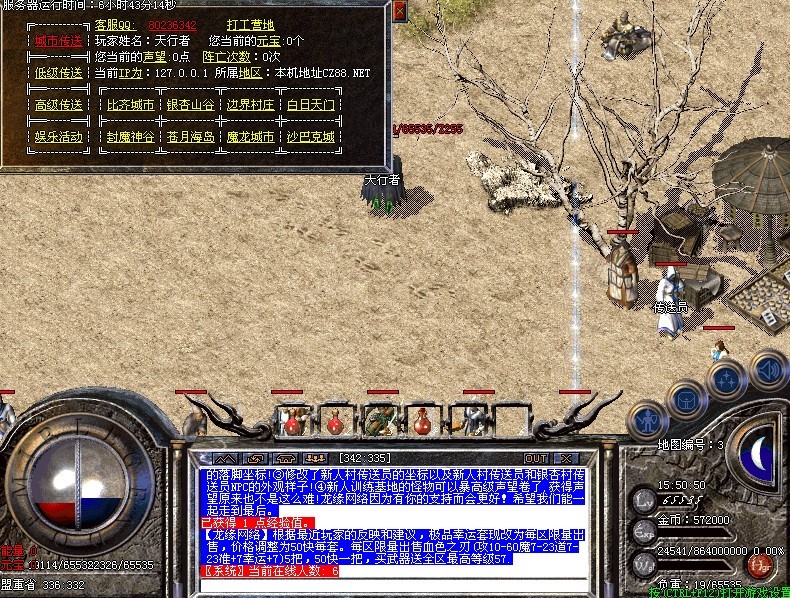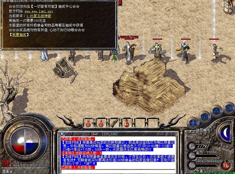 本次修改:①去掉了元宝抽奖里数据库里没有的物品<爱情鲜花>,更换为某件终极物品!②修改了盟重神秘老人传送到沙巴克影之道的落脚坐标!③修改了新人村传送员的坐标以及新人村传送员和银杏村传送员NPC的外观样子!④新人训练基地的怪物可以暴高级声望卷了,获得声望原来也不是这么难!