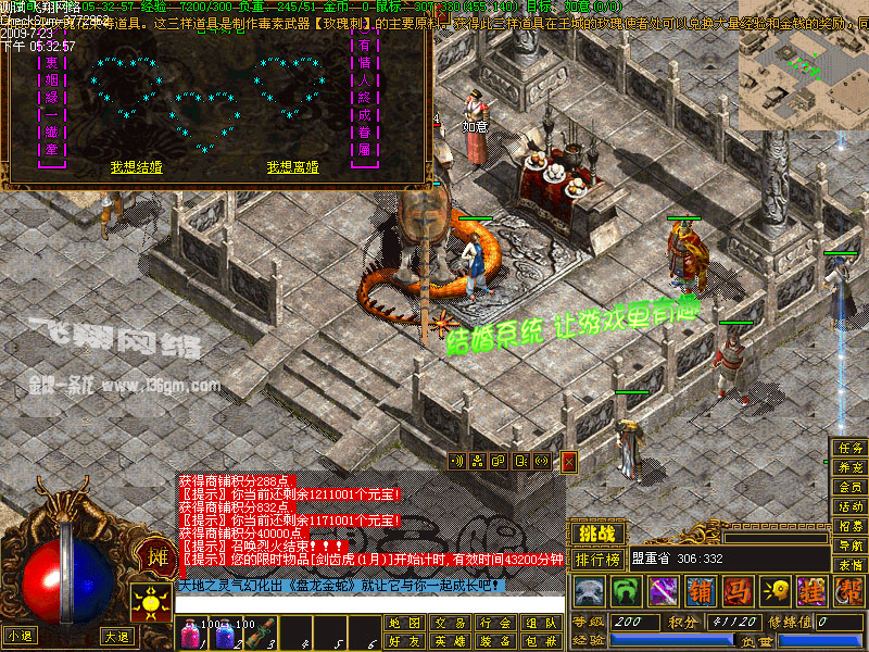 任务:如果你想利用任务来获得各种道具、经验、装备、元宝可以点右下边的“任务”按钮来接任务、查询任务、完成任务等。
