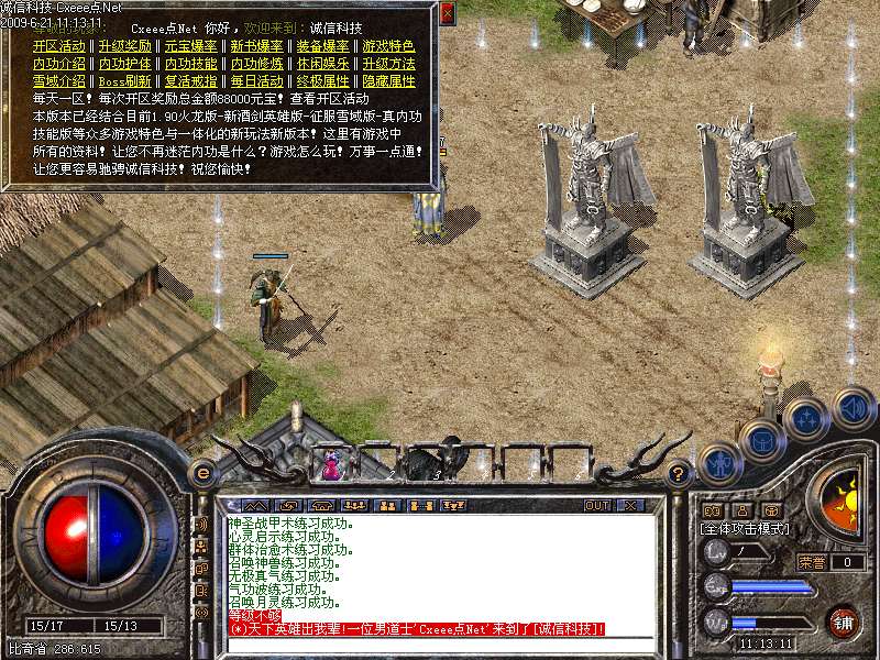 ⒏欢迎进入<$SERVERNAME>服务器!因本版本是唯一四大版本修改综合版!请所有玩家务必看下土城NPC(内功游戏攻略)!看完之后您才会了解本版本的独特性和新玩法新功能!谢谢您的支持!兑换荣誉查询火龙将军!六大功勋及热血之刃查询天外来客!兑换王者装备查询王者特使!