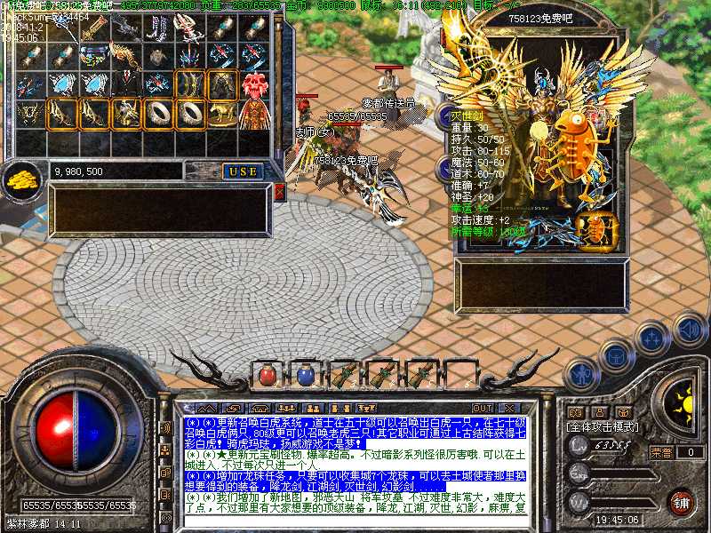 G(*)★所有的城内安全区里,全部设有万能NPC,在万能NPC处可以买卖任何物品,修理任何物品,存储任何物品,完全免费使用!!高级技能书籍,如彻地钉,可在新增地图里打BOSS爆出!
