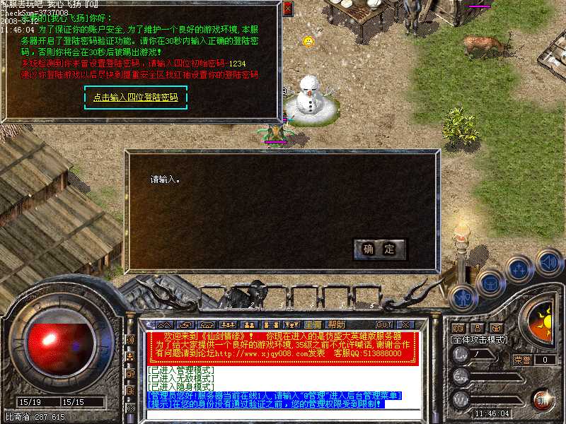 ★独家推出登陆密码验证功能 为了真正保护你的账户安全,本服务器采用了登陆密码验证功能,登陆游戏以后30秒内没有输入正确密码的将会自动断开连接。初次登陆密码为1234,建议你登陆游戏以后尽快到盟重安全区红袖处更改你的登陆密码