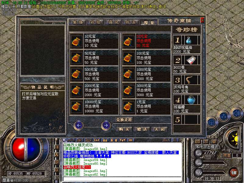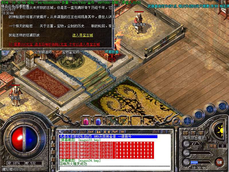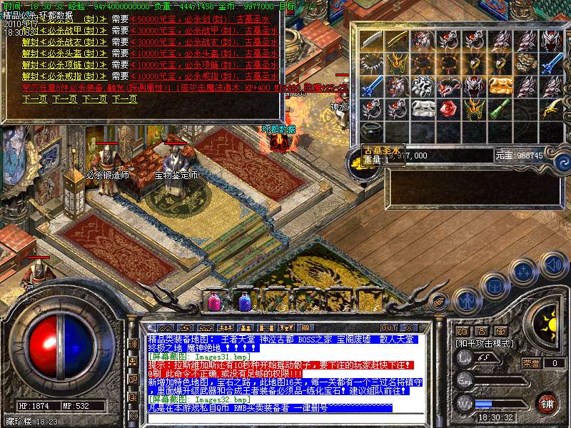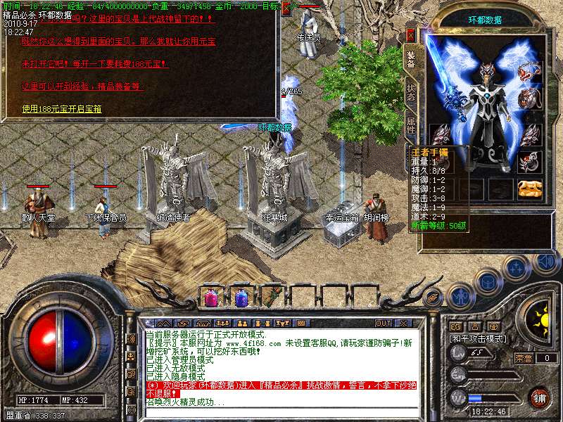4.特别地图:王者天堂为打宝天堂,每天16点开放.此地图任何大小怪物都可以有机率暴出赤月类装备和精品首饰、终极武器!