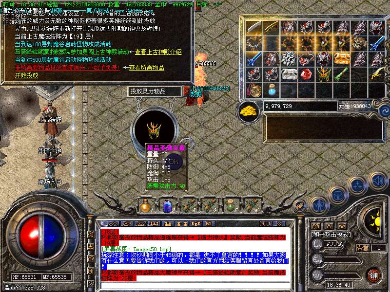 20. ①.天下第一:每职业等级第一名随时在比齐皇宫申请,可获得1.2倍攻魔道!②.行会争霸:每天下午18点,土城左上角点功城公告牌进入,