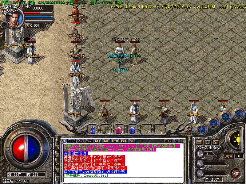 BOSS信息:土药每3小时刷新一只《弓箭手的小弟弟》,爆大量材料、元宝!还有机会爆会员、诛仙剑灵包、升级宝石包、魔族指令包!!死亡棺材、沃玛三层、石墓七层、教主大殿、尸魔三层、骨魔五层、封魔殿、幻境八层每三小时刷新一只大BOSS(详见传送员)!幻境10层每半小时刷新一次小BOSS,2小时刷新一次大BOSS(N个BOSS)!