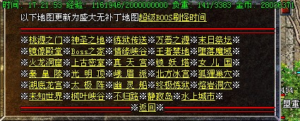 公告:高级装备攻略→上古合成(比奇城)→上古镶嵌(白日门)→2转装备(终极炼狱最后一层),每天中午12点30分举行年兽BOOS攻城,有几率爆出新技能