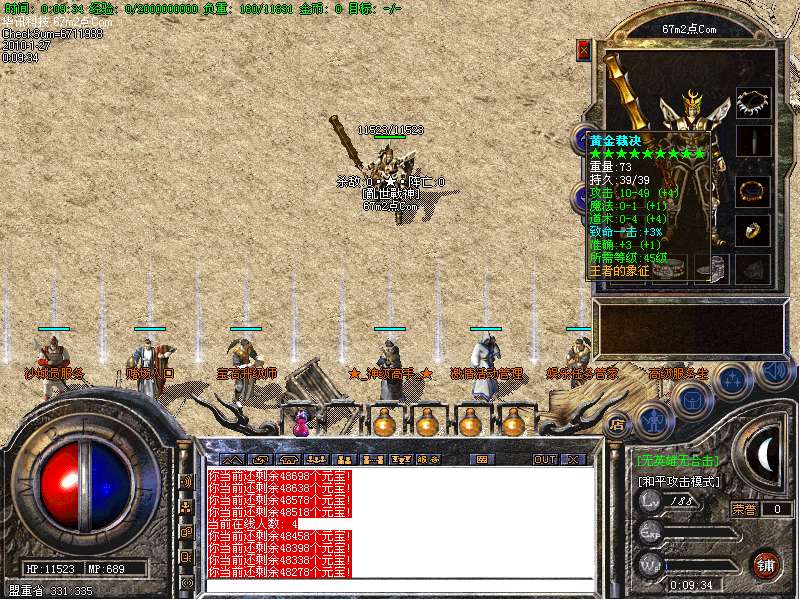 2.号角爆率1/1 沃玛教主每30分钟刷一次,开区后3天千人统一攻城战.沙城主奖励28888元宝!让你重新感受盛大千人攻城乐趣!