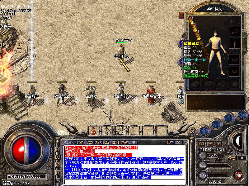 请玩家不要用60级以下的小号做仓库丢失物品概不负责.不要丢弃任何装备在地上导致消失不见谢谢合作... 练级建议到土右下角特别推荐的练级圣地,练级飞快!