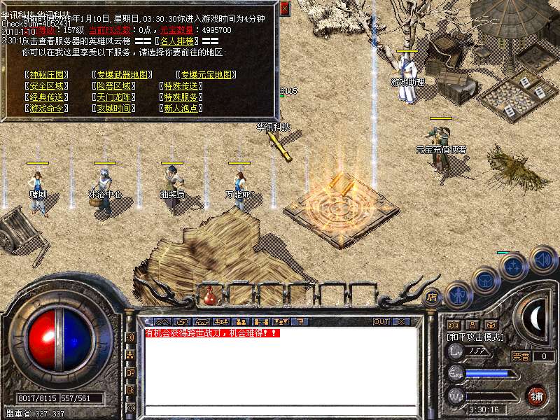 十.【游戏奖励】将玩家升到65级后可以到我们的“鸿运跨世”领取一套狂雷装备,首届拿沙奖励20000元宝,每日还可以领取3000元宝...练级建议到土右下角特别推荐的练级圣地,练级飞快!